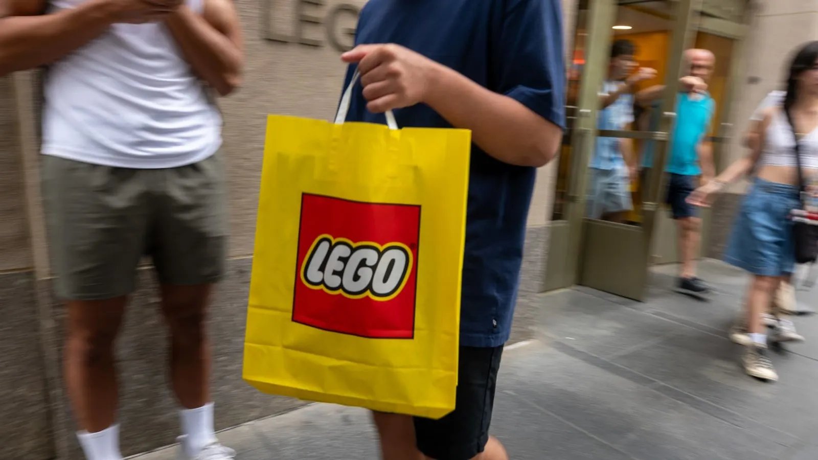 People depart a Lego store in Manhattan on August 29, 2024 in New York City.