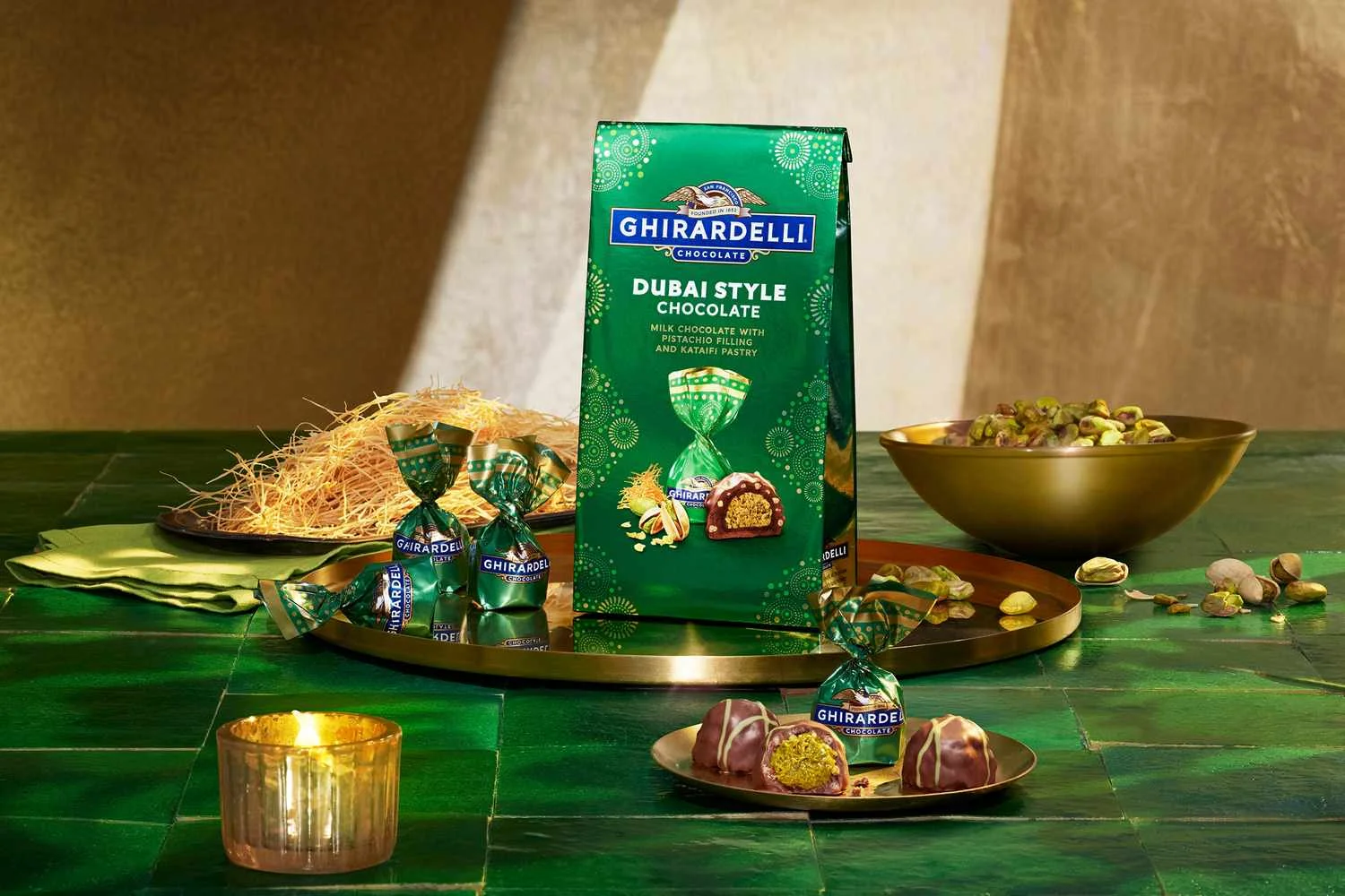 - Ghirardelli has joined the Dubai chocolate trend with new milk chocolate–covered truffles filled with pistachio cream and crunchy kataifi, offering a bite–sized spin on the viral dessert.