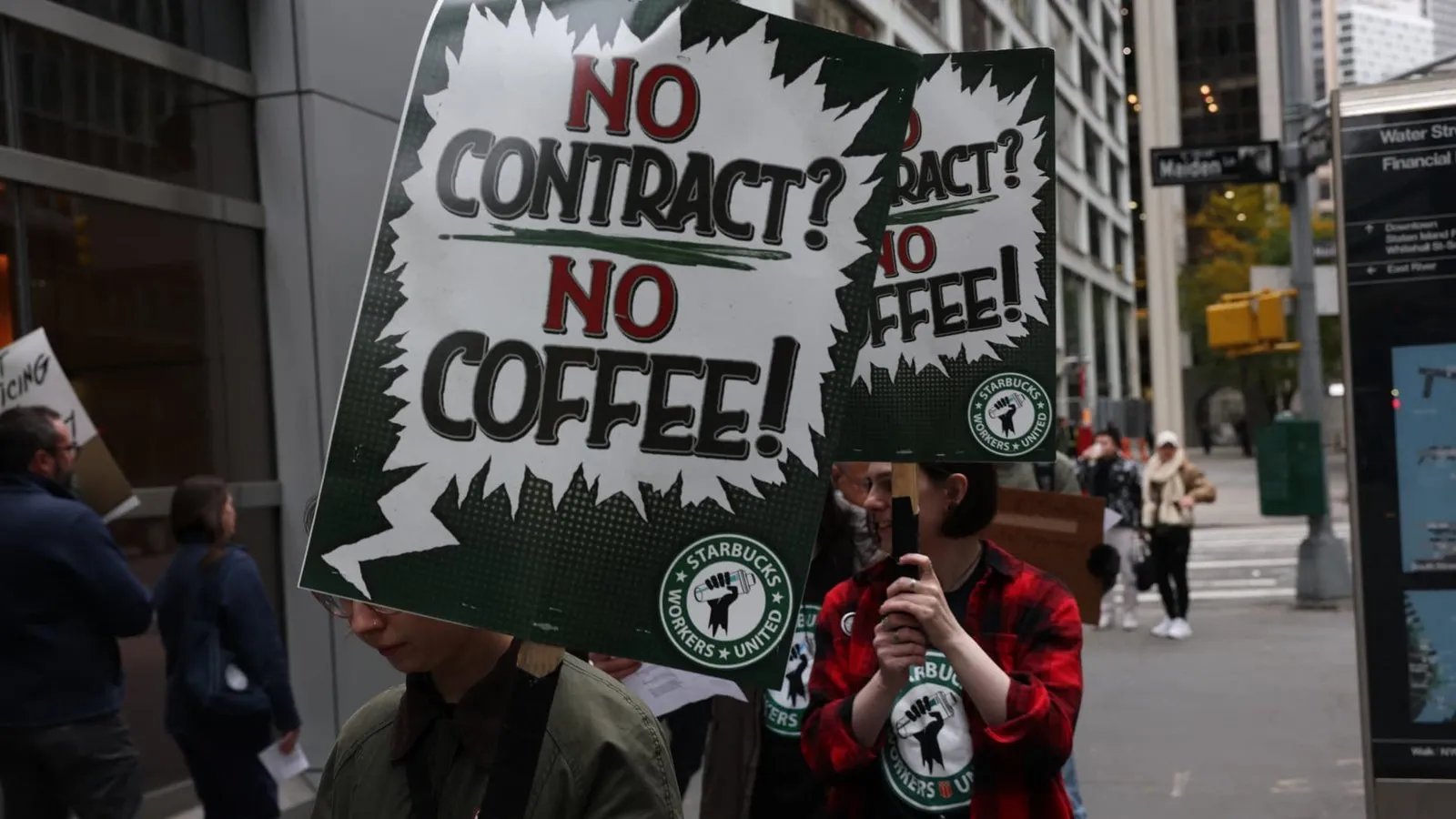 Starbucks baristas gather outside a Starbucks store as they protest against the company during a rally to demand a new contract in New York City, on October 28, 2025. The Starbucks Workers United is fighting for a new contract that delivers improved staffing hours, take-home pay, and on-the-job protections for baristas. (Photo by TIMOTHY A.CLARY / AFP) (Photo by TIMOTHY A.CLARY/AFP via Getty Images)