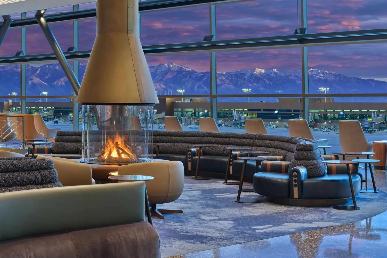 Well-suited to its mountainous surroundings, the supersized space conjures up images of a chic ski lodge with a large central fireplace that greets guests as they ride up the escalator. Most of the seating is done up in neutral and jewel-toned shades, some of which face enormous floor-to-ceiling windows framing the airplane movement outside.