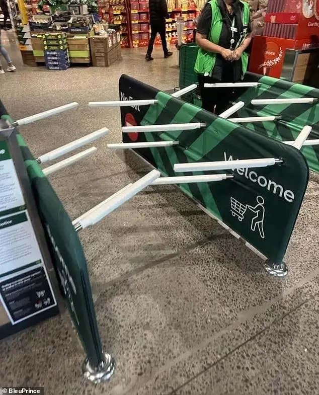 The controversial setup spotted at Woolworths Camberwell features a row of rotating baton-style arms that customers must push through to enter. It is designed to prevent people from leaving the store through the entrance, reducing opportunities for theft.