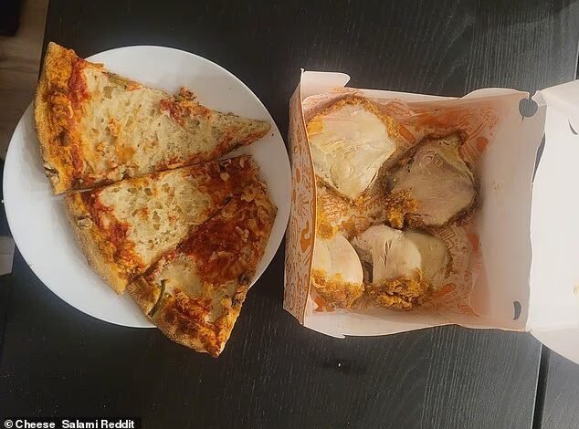 ‘Imagine leaving behind the only healthy part of the chicken. Pizza dough isn’t great for you, but only eating the cheese? What an experience,’ a man wrote.