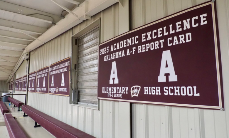 Every banner celebrates the 16 overall A grades that schools in the rural eastern Oklahoma district have received since 2013 on state report cards. A fresh one printed in 2025 signifies Warner’s high school and K-8 school were again among the top 5% highest-performing public schools in the state.
