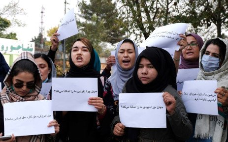Afghan women and girls take part in a protest in front of the Ministry of Education in Kabul on March 26, 2022, demanding that high schools be reopened for girls. (Photo by Ahmad SAHEL ARMAN / AFP)
